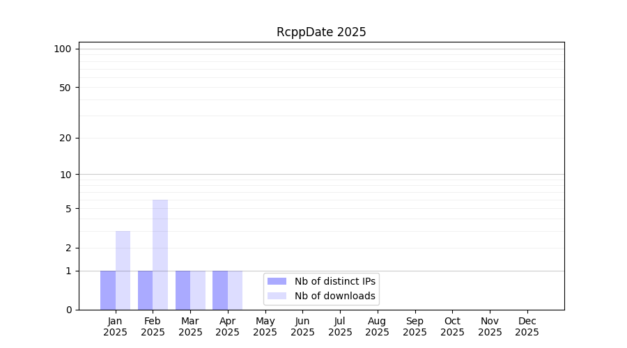Number of downloads for annotation package RcppDate, year by year, from 2025 back to 2014 (years with no downloads are omitted):