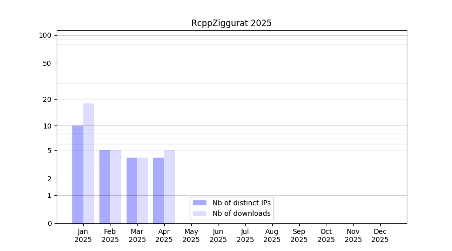 Number of downloads for annotation package RcppZiggurat, year by year, from 2025 back to 2014 (years with no downloads are omitted):