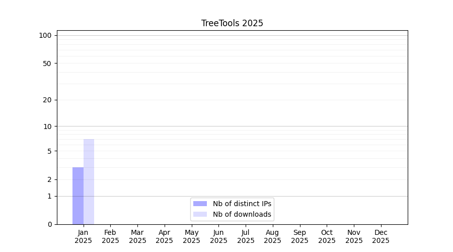Number of downloads for annotation package TreeTools, year by year, from 2025 back to 2014 (years with no downloads are omitted):