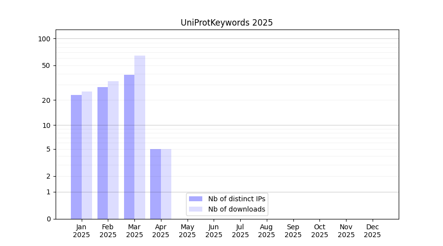 Number of downloads for annotation package UniProtKeywords, year by year, from 2025 back to 2014 (years with no downloads are omitted):
