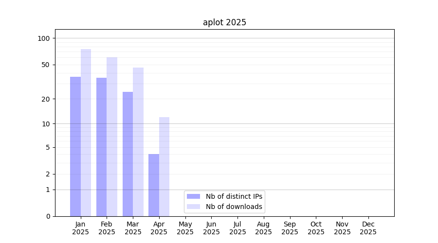 Number of downloads for annotation package aplot, year by year, from 2025 back to 2014 (years with no downloads are omitted):