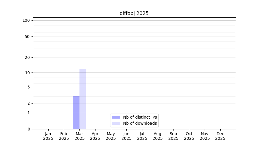 Number of downloads for annotation package diffobj, year by year, from 2025 back to 2014 (years with no downloads are omitted):