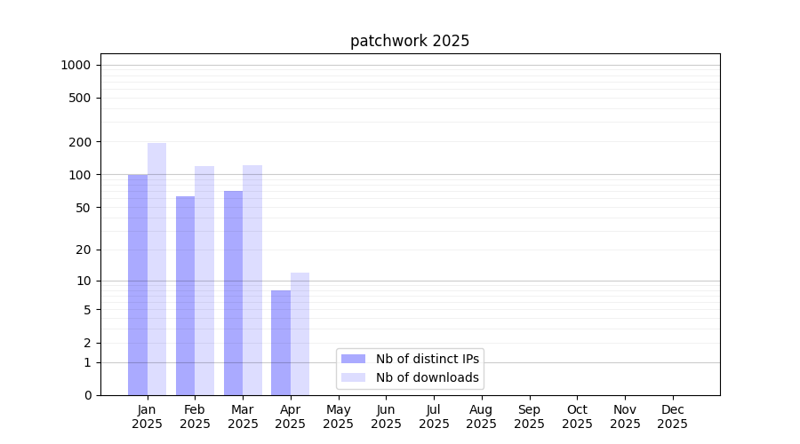 Number of downloads for annotation package patchwork, year by year, from 2025 back to 2014 (years with no downloads are omitted):