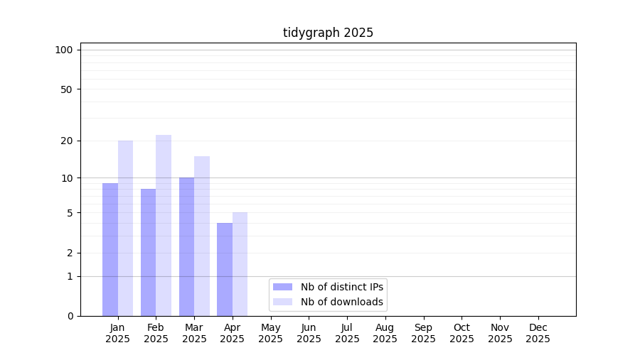 Number of downloads for annotation package tidygraph, year by year, from 2025 back to 2014 (years with no downloads are omitted):