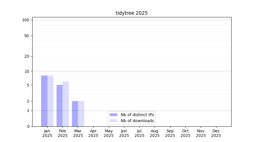 Number of downloads for annotation package tidytree, year by year, from 2025 back to 2014 (years with no downloads are omitted):