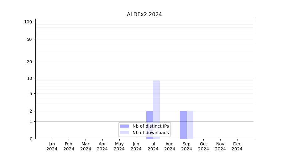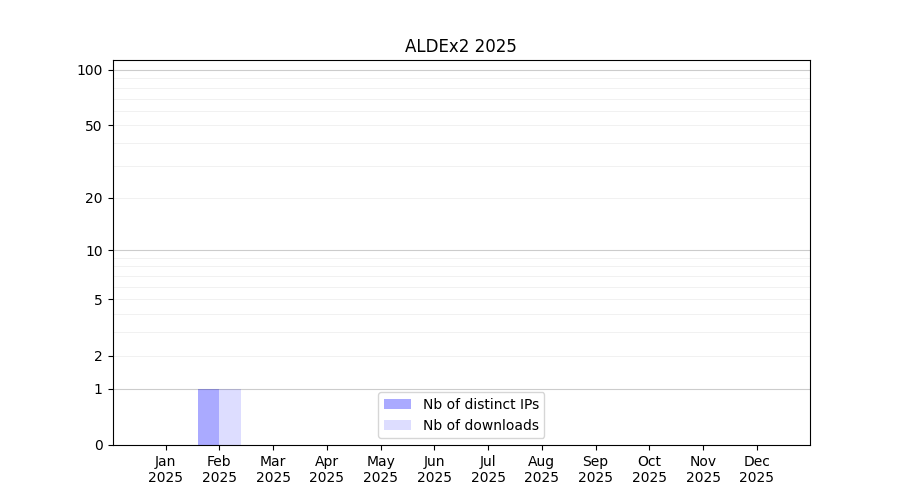 Number of downloads for experiment package ALDEx2, year by year, from 2025 back to 2014 (years with no downloads are omitted):