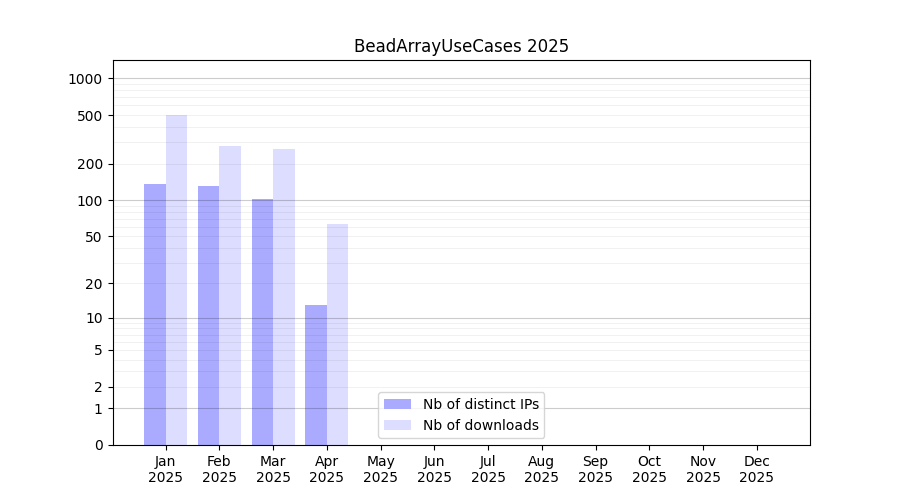 Number of downloads for experiment package BeadArrayUseCases, year by year, from 2025 back to 2014 (years with no downloads are omitted):