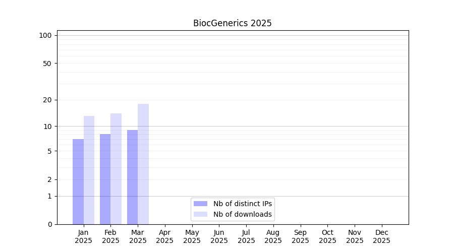 Number of downloads for experiment package BiocGenerics, year by year, from 2025 back to 2014 (years with no downloads are omitted):