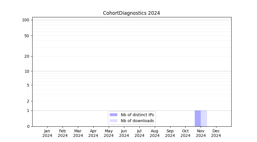 Number of downloads for experiment package CohortDiagnostics, year by year, from 2025 back to 2014 (years with no downloads are omitted):