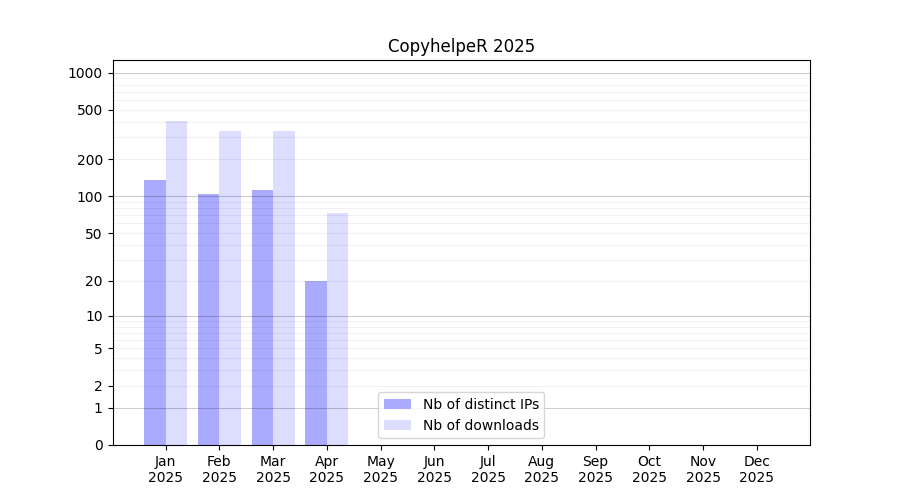 Number of downloads for experiment package CopyhelpeR, year by year, from 2025 back to 2014 (years with no downloads are omitted):