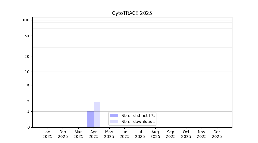 Number of downloads for experiment package CytoTRACE, year by year, from 2025 back to 2014 (years with no downloads are omitted):