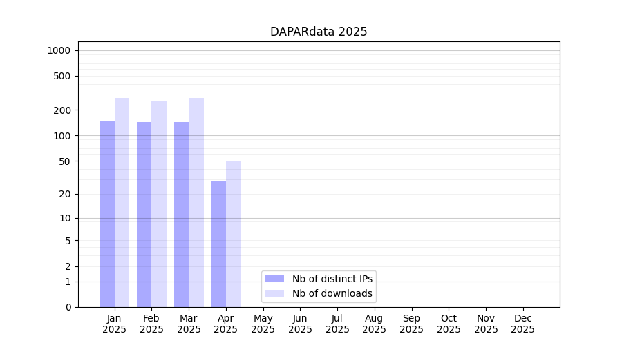 Number of downloads for experiment package DAPARdata, year by year, from 2025 back to 2014 (years with no downloads are omitted):