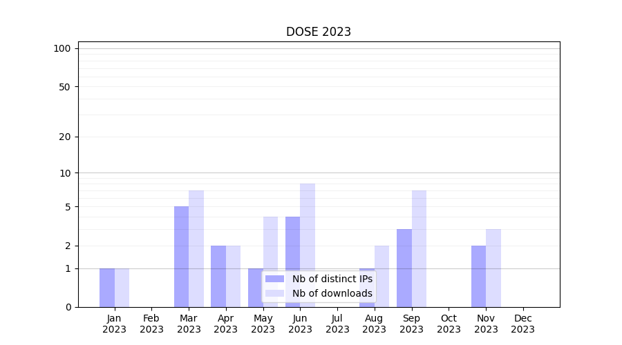 Number of downloads for experiment package DOSE, year by year, from 2025 back to 2014 (years with no downloads are omitted):