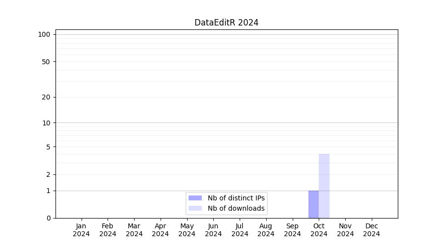 Number of downloads for experiment package DataEditR, year by year, from 2025 back to 2014 (years with no downloads are omitted):