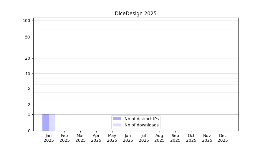 Number of downloads for experiment package DiceDesign, year by year, from 2025 back to 2014 (years with no downloads are omitted):