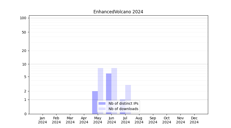 Number of downloads for experiment package EnhancedVolcano, year by year, from 2025 back to 2014 (years with no downloads are omitted):