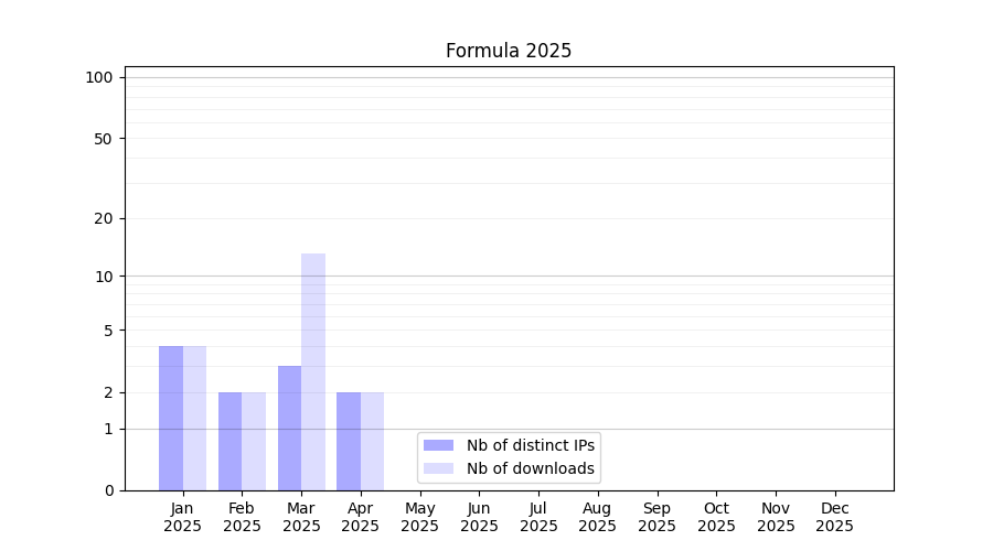 Number of downloads for experiment package Formula, year by year, from 2025 back to 2014 (years with no downloads are omitted):