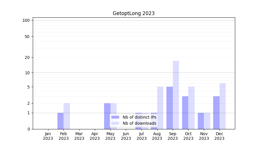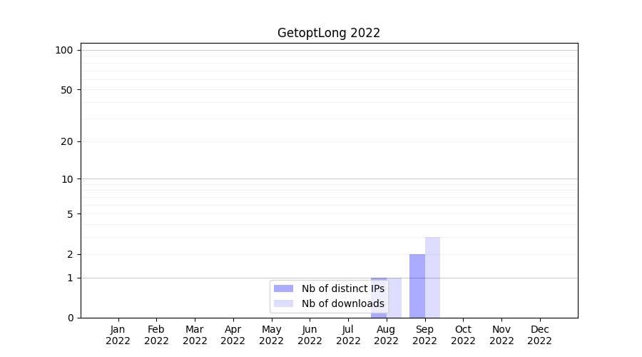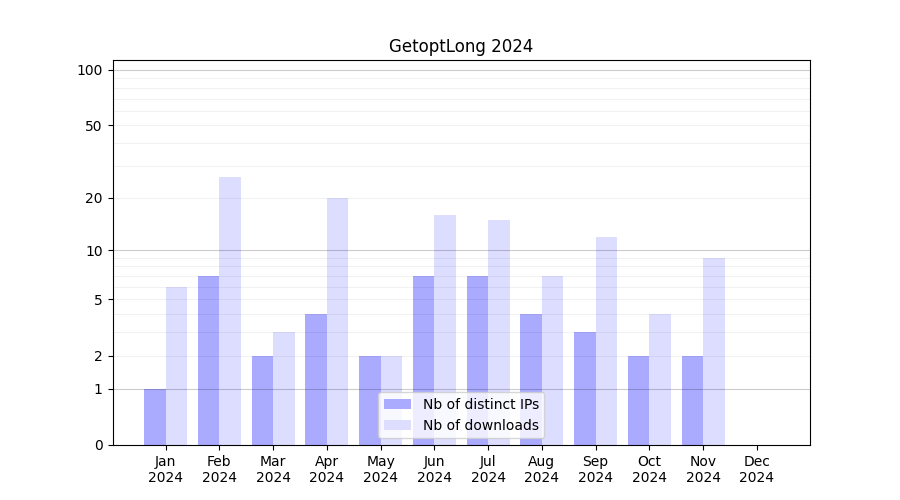Number of downloads for experiment package GetoptLong, year by year, from 2025 back to 2014 (years with no downloads are omitted):