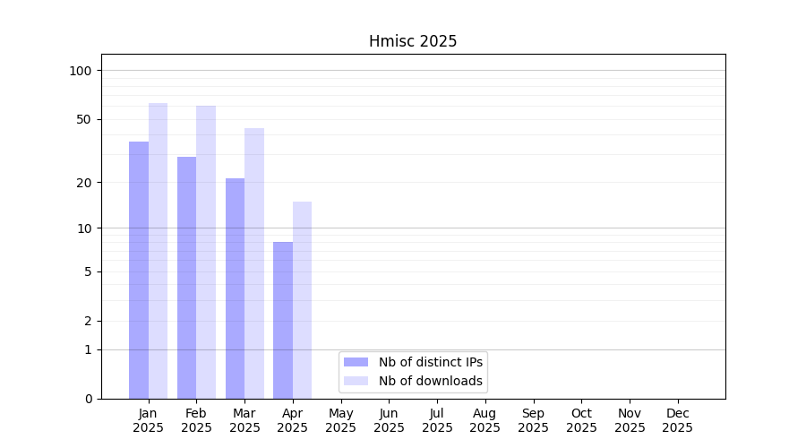 Number of downloads for experiment package Hmisc, year by year, from 2025 back to 2014 (years with no downloads are omitted):