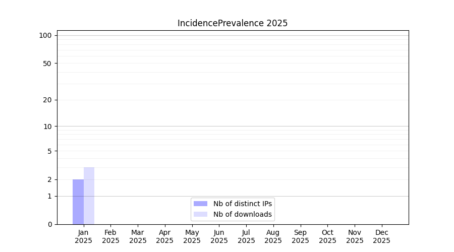 Number of downloads for experiment package IncidencePrevalence, year by year, from 2025 back to 2014 (years with no downloads are omitted):