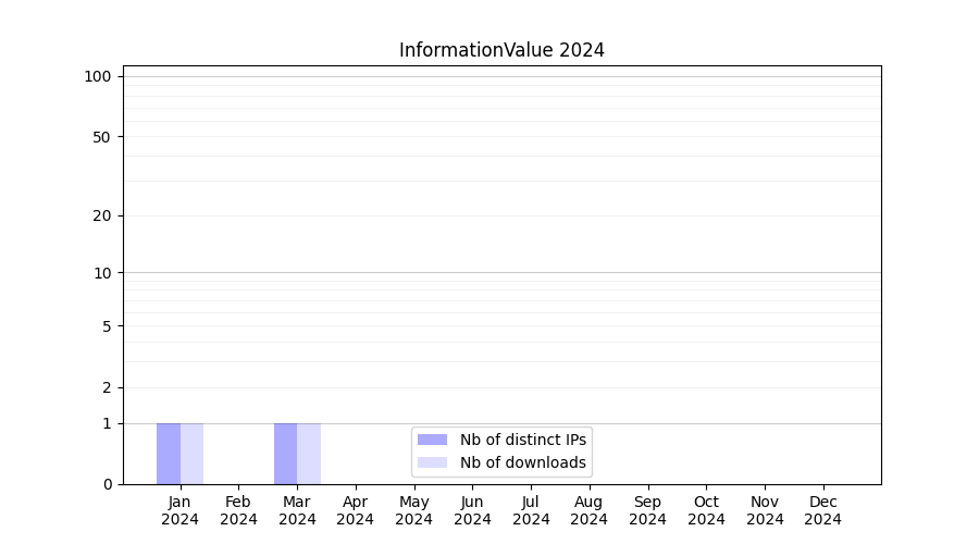 Number of downloads for experiment package InformationValue, year by year, from 2025 back to 2014 (years with no downloads are omitted):
