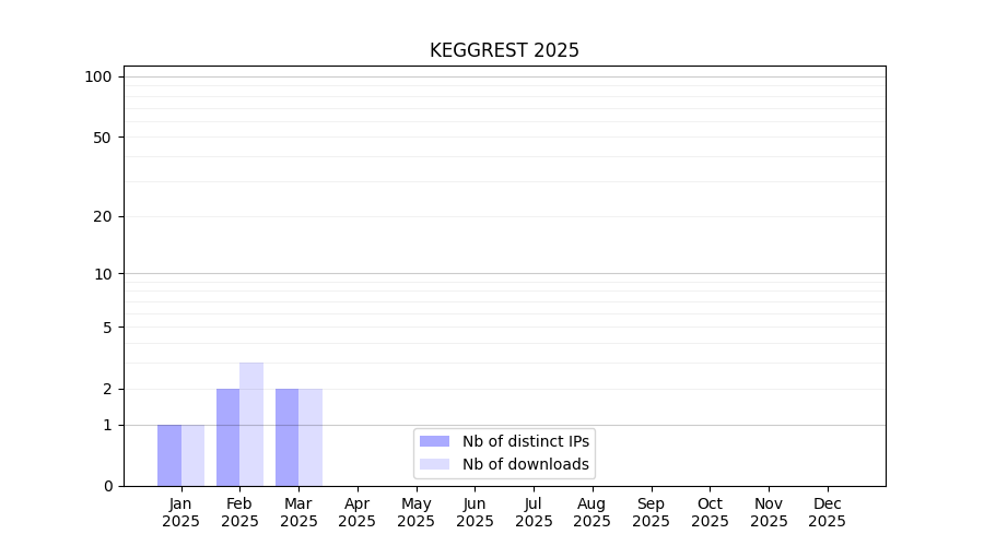 Number of downloads for experiment package KEGGREST, year by year, from 2025 back to 2014 (years with no downloads are omitted):