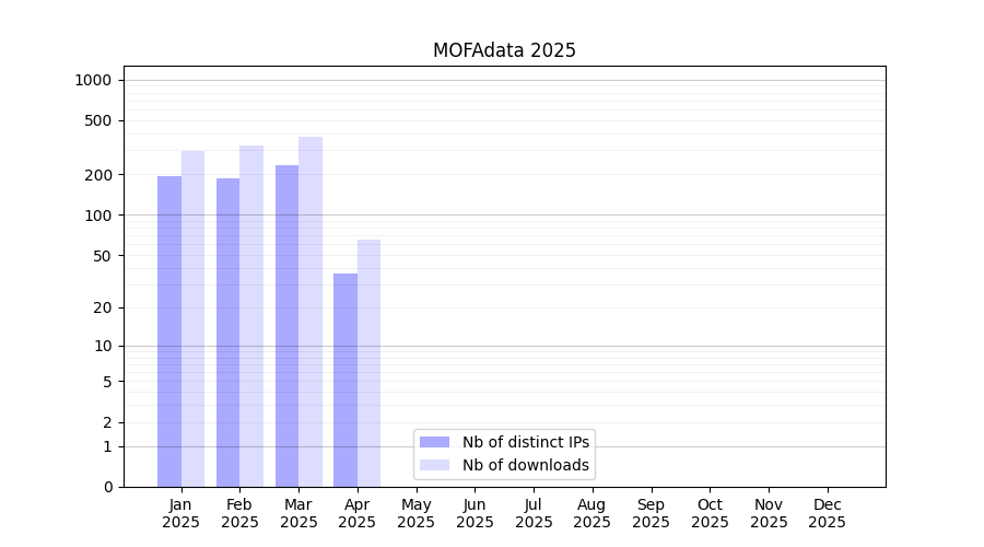 Number of downloads for experiment package MOFAdata, year by year, from 2025 back to 2014 (years with no downloads are omitted):