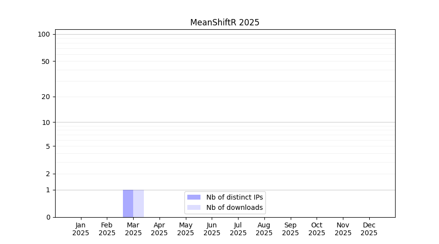 Number of downloads for experiment package MeanShiftR, year by year, from 2025 back to 2014 (years with no downloads are omitted):