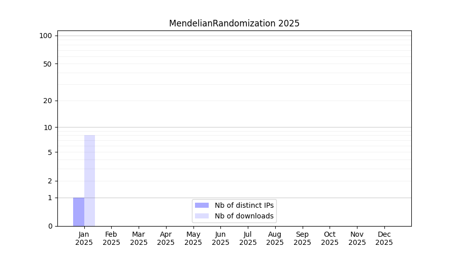 Number of downloads for experiment package MendelianRandomization, year by year, from 2025 back to 2014 (years with no downloads are omitted):