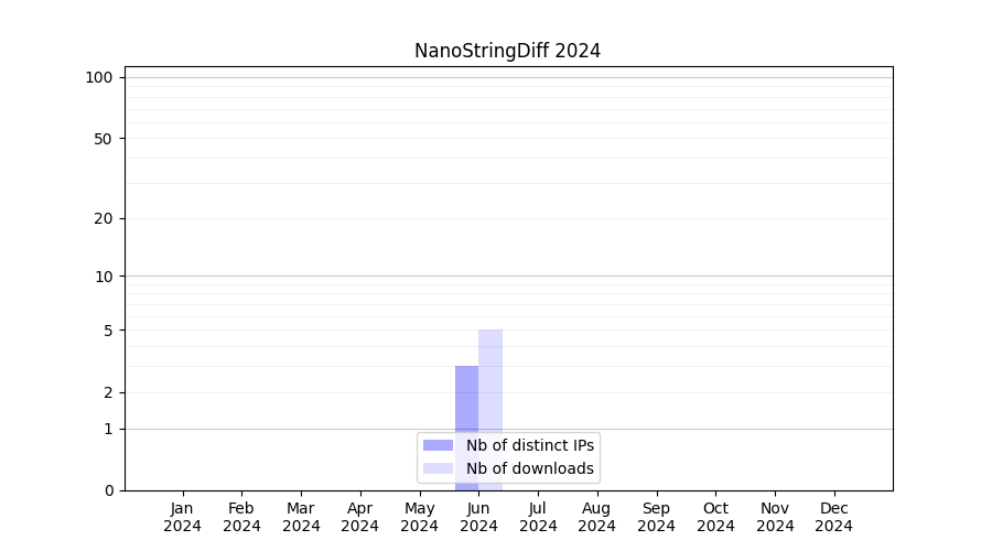Number of downloads for experiment package NanoStringDiff, year by year, from 2025 back to 2014 (years with no downloads are omitted):