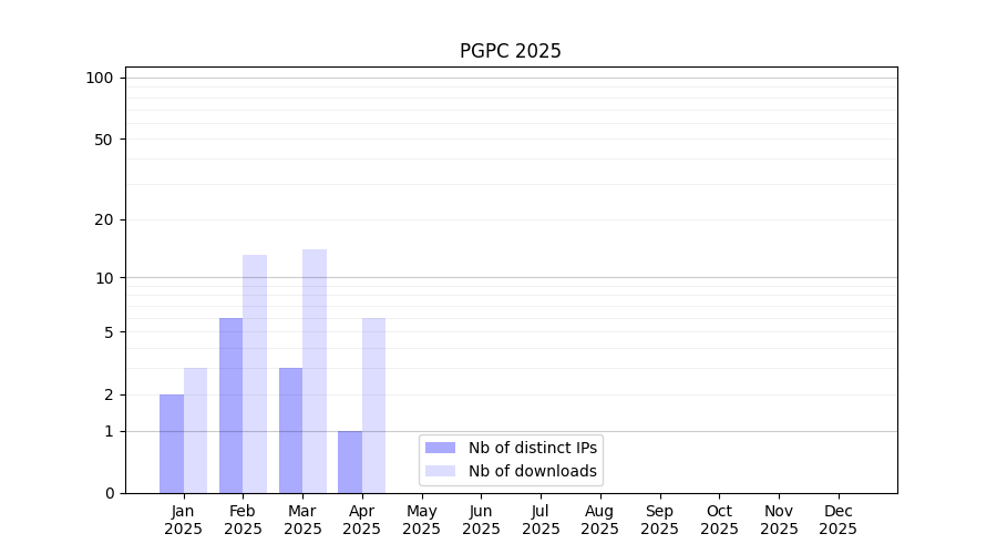 Number of downloads for experiment package PGPC, year by year, from 2025 back to 2014 (years with no downloads are omitted):