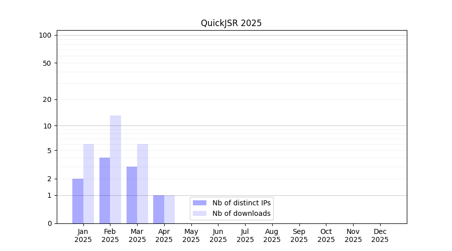 Number of downloads for experiment package QuickJSR, year by year, from 2025 back to 2014 (years with no downloads are omitted):