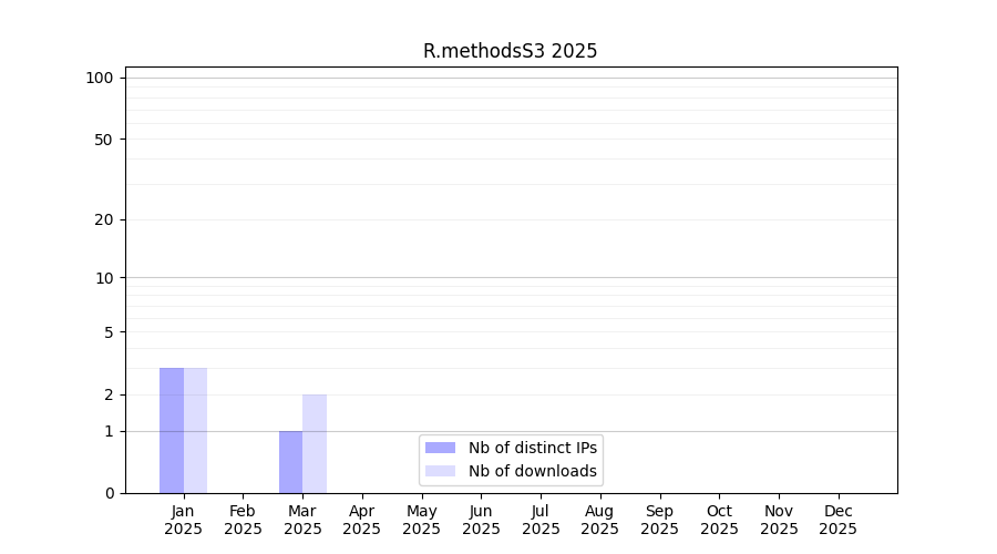 Number of downloads for experiment package R.methodsS3, year by year, from 2025 back to 2014 (years with no downloads are omitted):