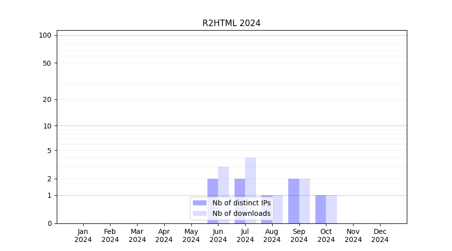 Number of downloads for experiment package R2HTML, year by year, from 2025 back to 2014 (years with no downloads are omitted):
