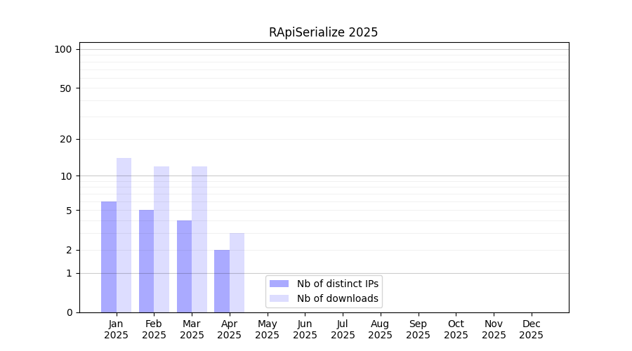 Number of downloads for experiment package RApiSerialize, year by year, from 2025 back to 2014 (years with no downloads are omitted):