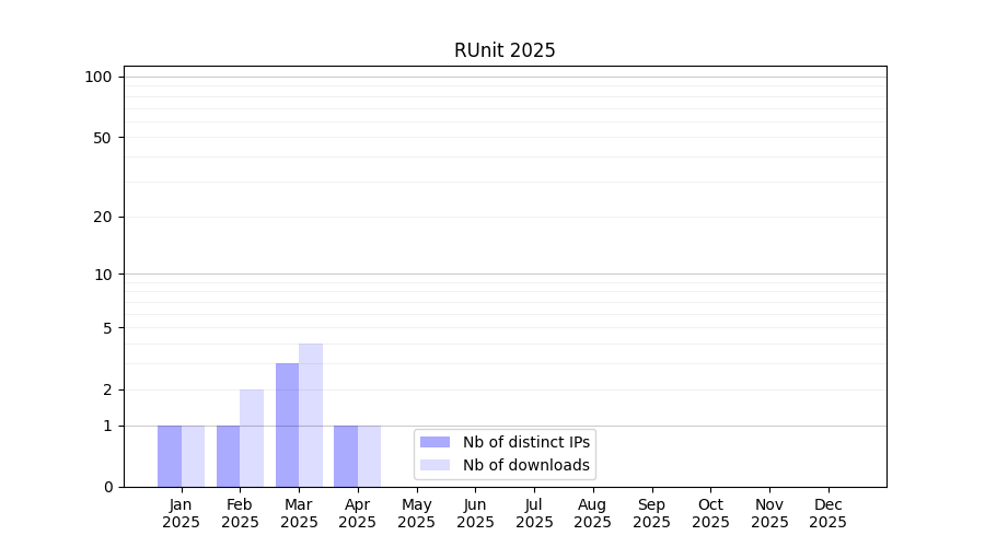 Number of downloads for experiment package RUnit, year by year, from 2025 back to 2014 (years with no downloads are omitted):