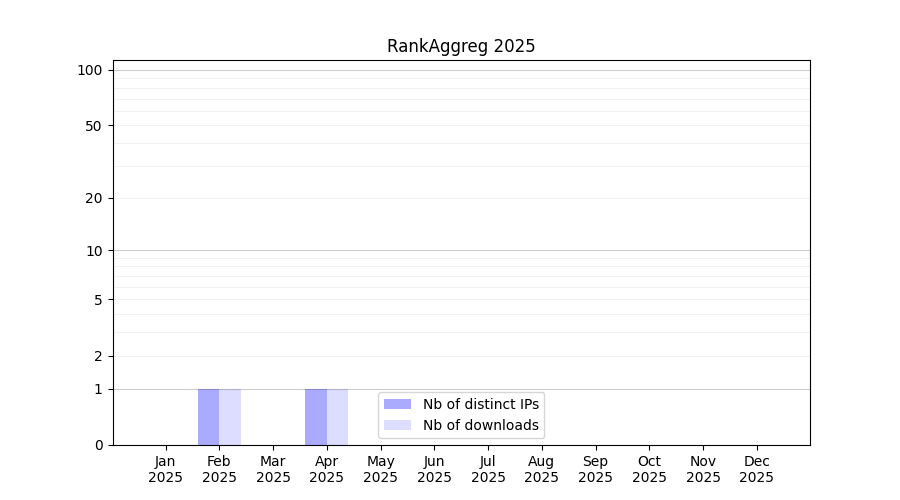 Number of downloads for experiment package RankAggreg, year by year, from 2025 back to 2014 (years with no downloads are omitted):