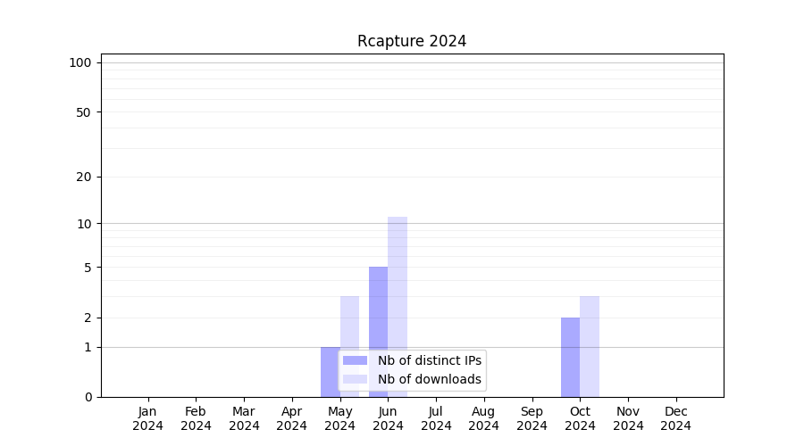 Number of downloads for experiment package Rcapture, year by year, from 2025 back to 2014 (years with no downloads are omitted):