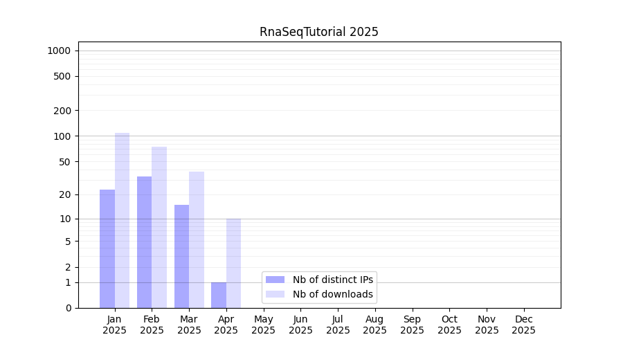 Number of downloads for experiment package RnaSeqTutorial, year by year, from 2025 back to 2014 (years with no downloads are omitted):