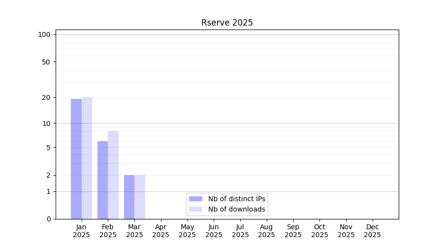 Number of downloads for experiment package Rserve, year by year, from 2025 back to 2014 (years with no downloads are omitted):