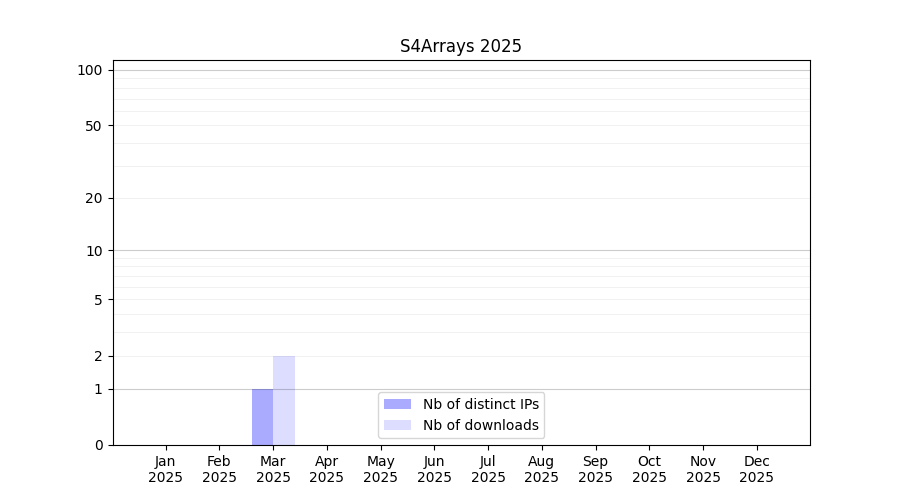 Number of downloads for experiment package S4Arrays, year by year, from 2025 back to 2014 (years with no downloads are omitted):