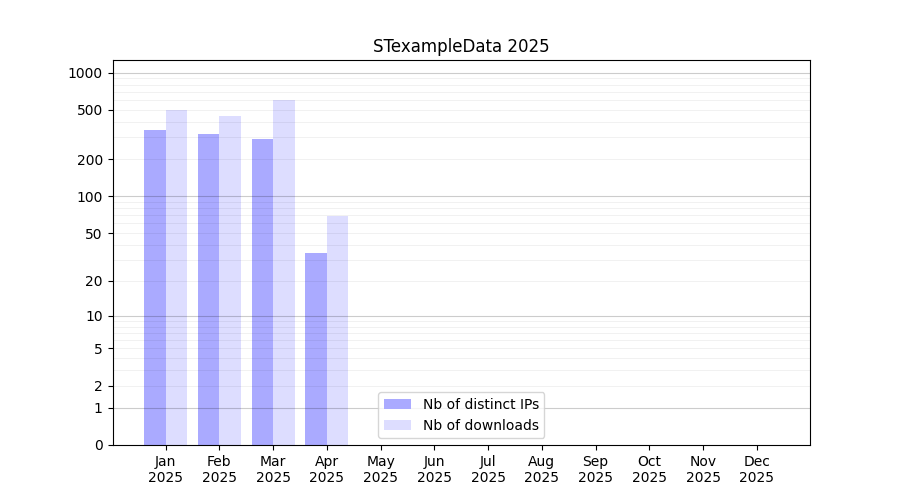 Number of downloads for experiment package STexampleData, year by year, from 2025 back to 2014 (years with no downloads are omitted):