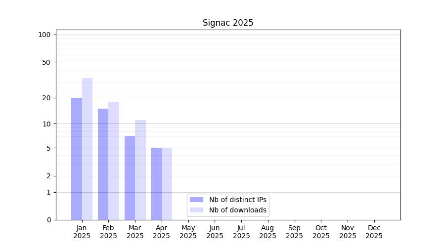 Number of downloads for experiment package Signac, year by year, from 2025 back to 2014 (years with no downloads are omitted):
