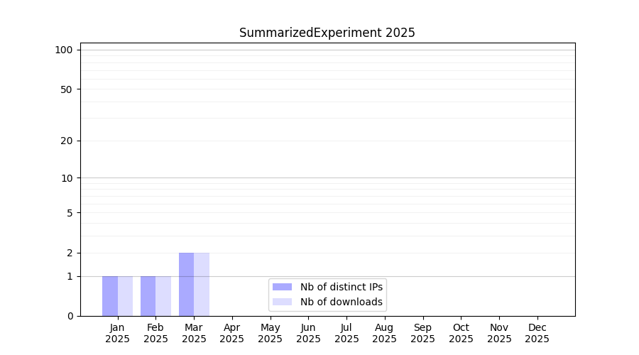 Number of downloads for experiment package SummarizedExperiment, year by year, from 2025 back to 2014 (years with no downloads are omitted):