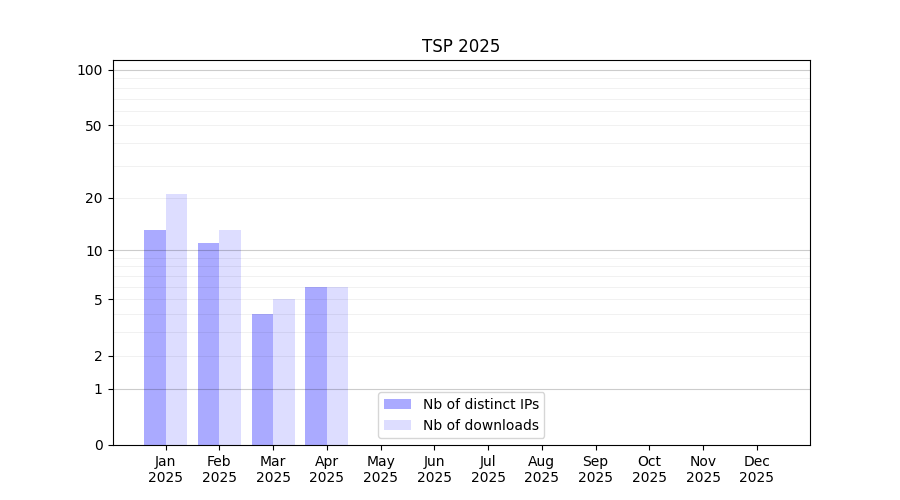 Number of downloads for experiment package TSP, year by year, from 2025 back to 2014 (years with no downloads are omitted):