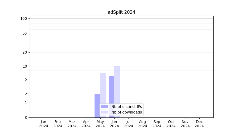 Number of downloads for experiment package adSplit, year by year, from 2025 back to 2014 (years with no downloads are omitted):