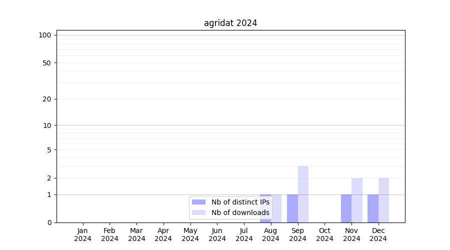 Number of downloads for experiment package agridat, year by year, from 2025 back to 2014 (years with no downloads are omitted):