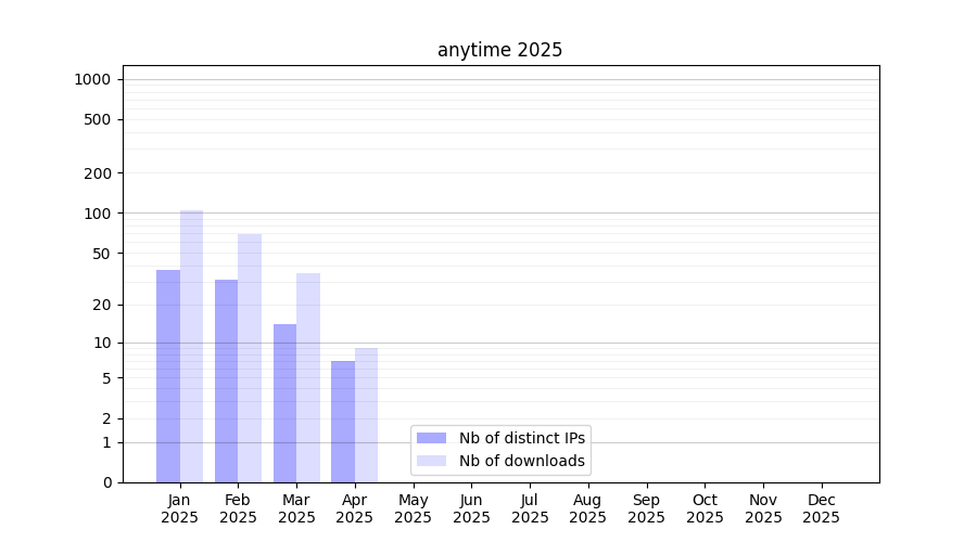 Number of downloads for experiment package anytime, year by year, from 2025 back to 2014 (years with no downloads are omitted):