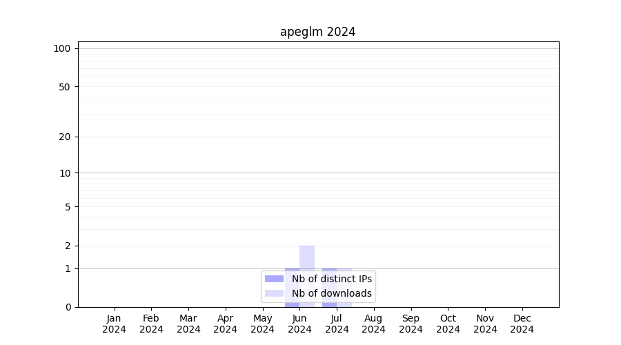 Number of downloads for experiment package apeglm, year by year, from 2025 back to 2014 (years with no downloads are omitted):