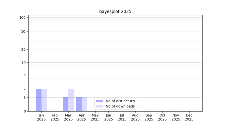 Number of downloads for experiment package bayesplot, year by year, from 2025 back to 2014 (years with no downloads are omitted):